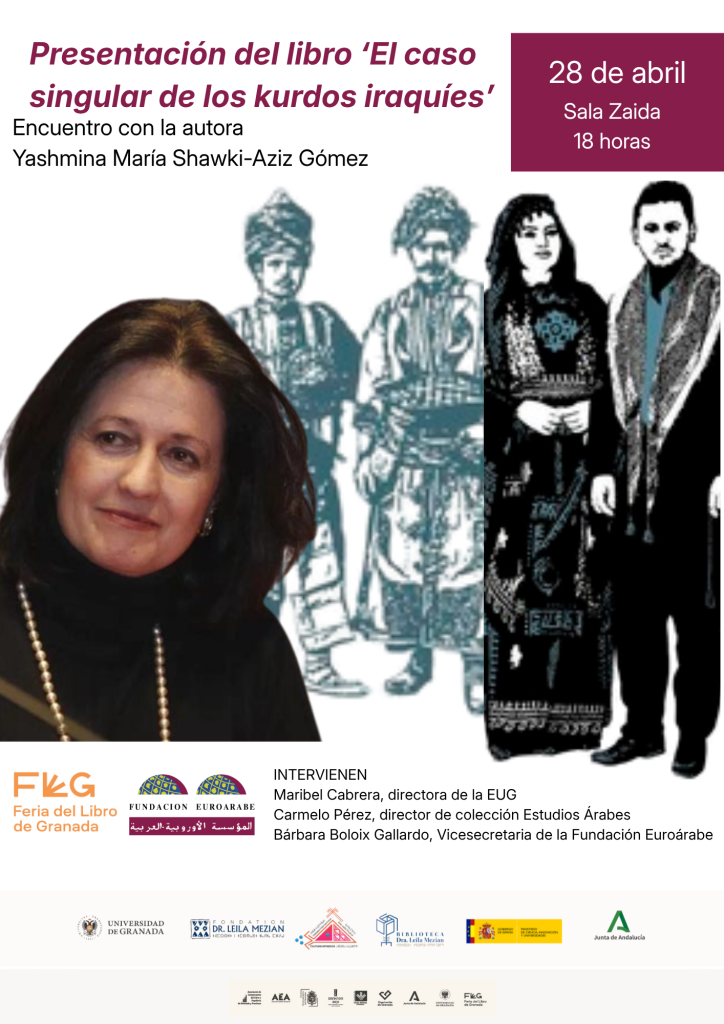 La Fundación Euroárabe presenta el libro ‘El caso singular de los kurdos iraquíes’ con su autora, Yashmina María Shawki-Aziz Gómez, acompañados por Maribel Cabrera, directora de la EUG, Carmelo Pérez, director de la colección Estudios Árabes, y acompañada por Bárbara Boloix Gallardo, Vicesecretaria de la Fundación Euroárabe, en la Sala Zaida y como parte de la programación de la Feria del Libro de Granada.
