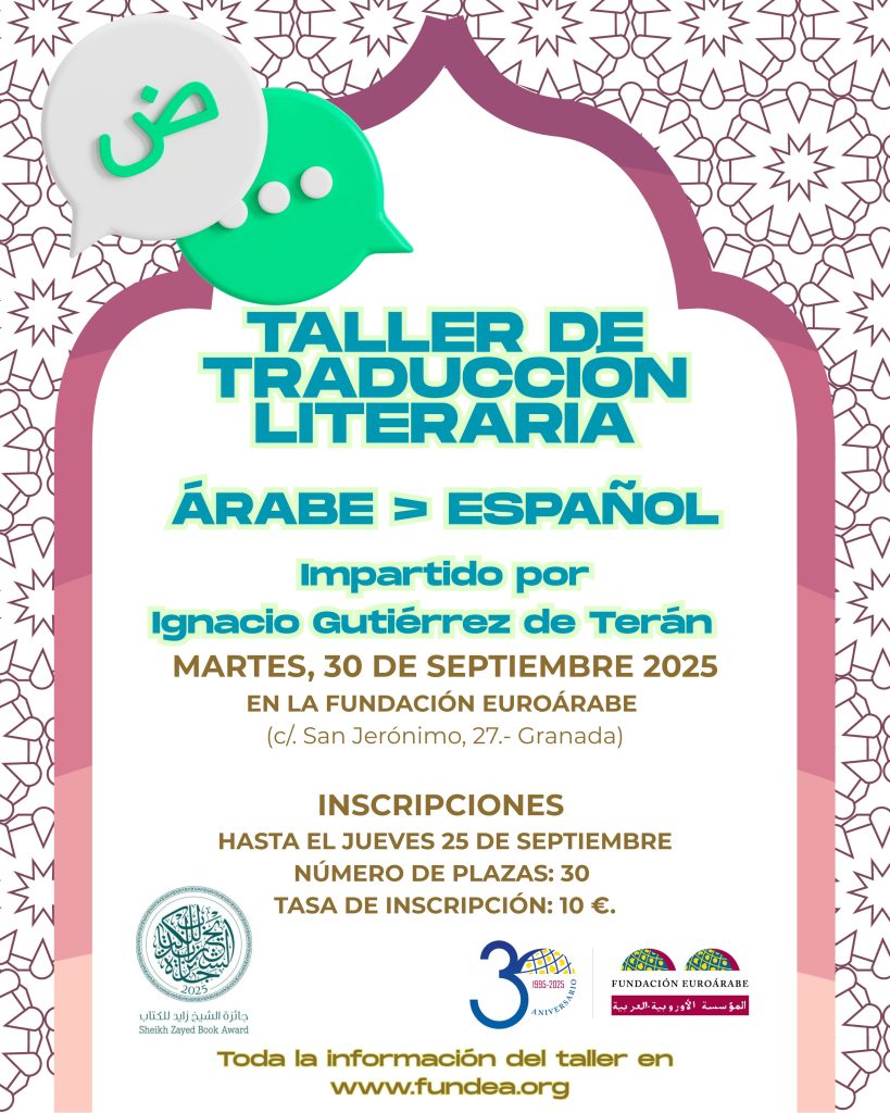 El taller de Traducción Literaria del árabe al español se inserta en el programa que coorganizan la Fundación Euroárabe y el Premio Sheikh del Libro durante 2025 bajo el lema “Lengua, literatura y artes árabes al servicio del entendimiento entre oriente y occidente”.